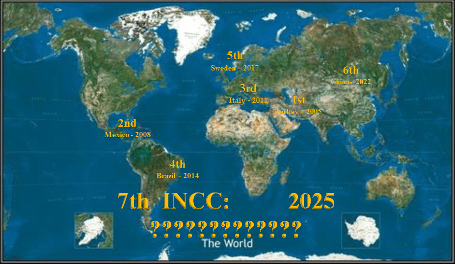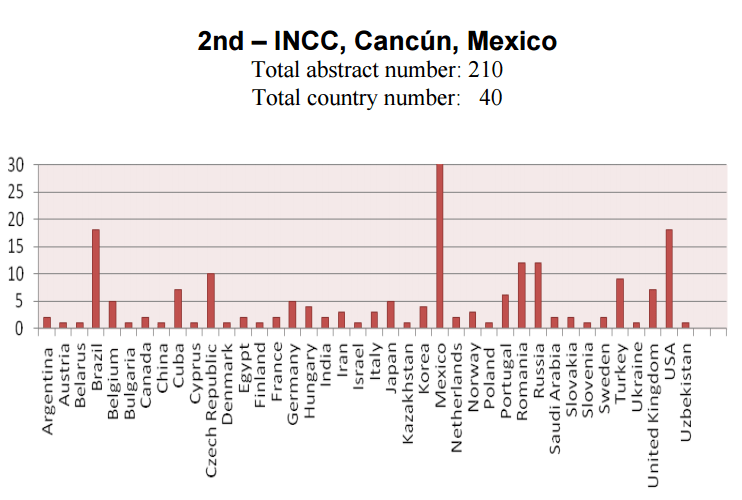 The analysis of data related to past Congresses reveals that the total numbers of partecipating countries about 30 – 40 countries per congress and the numbers of presented contributions varied between 170 – 210. This is a clear indication that the INCC Congress series have reached a practically stable participants potential.